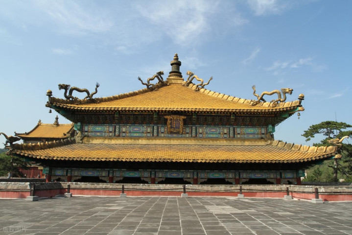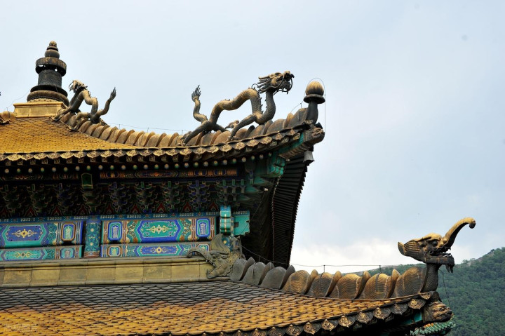 主殿“妙高庄严殿”的屋顶,全部用鎏金的铜瓦铺成,当年用了上万两黄金,阳光一照,屋脊几条鎏金铜龙,金光灿烂,晃得人睁不开眼,给足了面子。