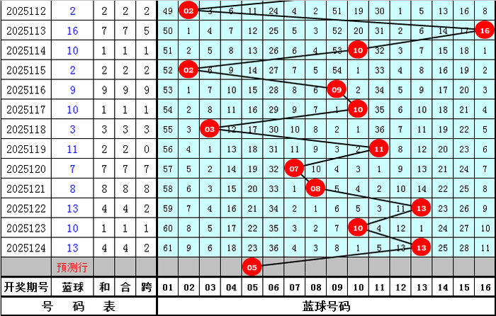 蓝球推荐:蓝球上期开出奖号13,为奇数蓝球,本期预计蓝球继续开出奇数号码,蓝球参考03、05、07、08、11。