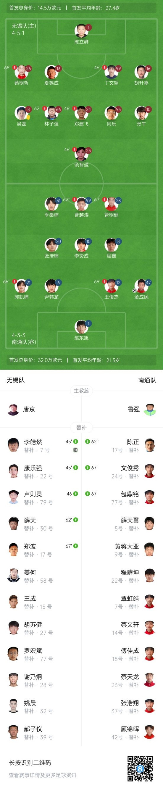 第53分钟,无锡扳平比分,右路角球开到禁区赵东旭扑球不远,余智诚头球吊射被扑出,第二点李皓然补射破门,无锡1-1南通。↓