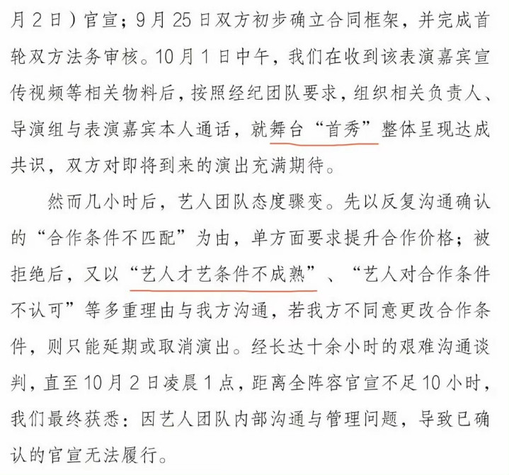 结果就在几个小时后,对方突然变卦,以“合作条件不匹配”为由单方面要求提价,遭拒后又以“艺人才艺不成熟”“艺人不认可合作条件”等理由施压,甚至提出延期或取消演出。
