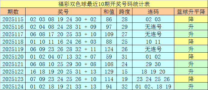 上期开奖:福彩双色球第2025124奖号开出:01 02 18 19 21 33 + 13,红球号码和值为94,首尾间距为32,包含连号:01 02、18 19。