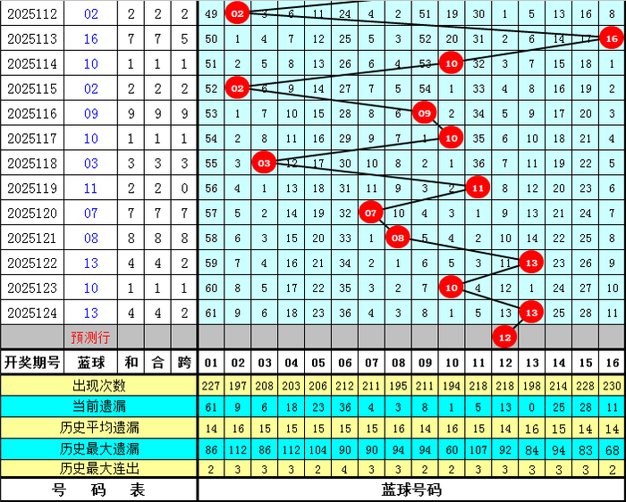 蓝球分析:上期蓝球开出号码13,上升3个点位,最近10期蓝球号码升平降分别为:降、升、升、降、升、降、升、升、降、升,本期看好蓝球下降,独蓝参考12。
