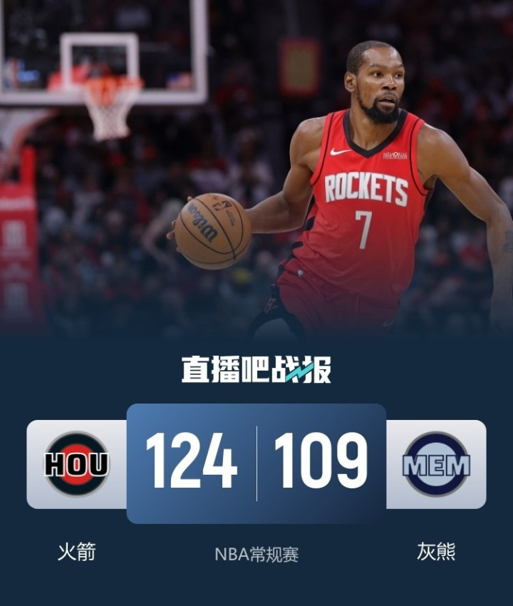 今日NBA常规赛,灰熊火箭队客场124-109战胜灰熊。
