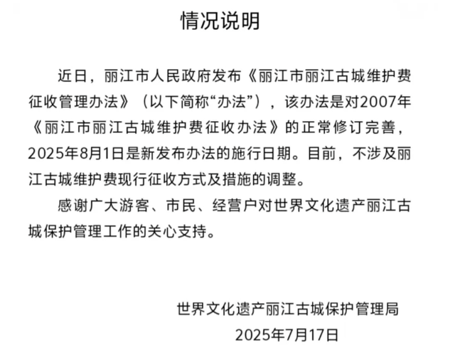 据观察者网报道,丽江古城的维护费从2001年就开始征收了,2007年首次出台了《征收办法》,这次的收费规定是对旧版的修订,并不是新增收费。