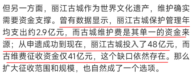丽江古城作为世界文化遗产,每年需要大量资金维护。根据澎湃新闻报道,丽江古城每年的维护管理费需要2.9亿,从申遗成功到现在,已经投入了48亿,征收的资金仅41亿,资金缺口大,官方不得不设卡收费。